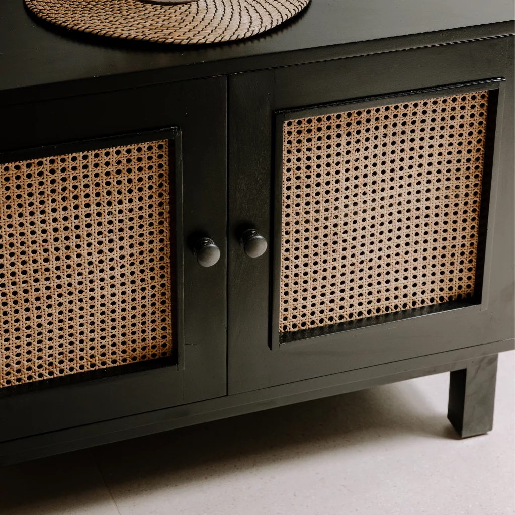 Dotée d'une structure de coloris noir et solide en bois d'acajou et de portes revêtues de cannage en rotin, ce meuble est la tendance du moment ! Il apportera convivialité et chaleur à votre maison.